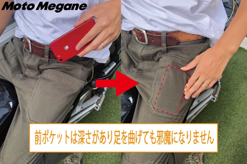 ポケットを深くすることで、物を入れて乗車しても、物が脚の付け根に当たりにくく、ライディング時にも足の動きを妨げにくい設計です。