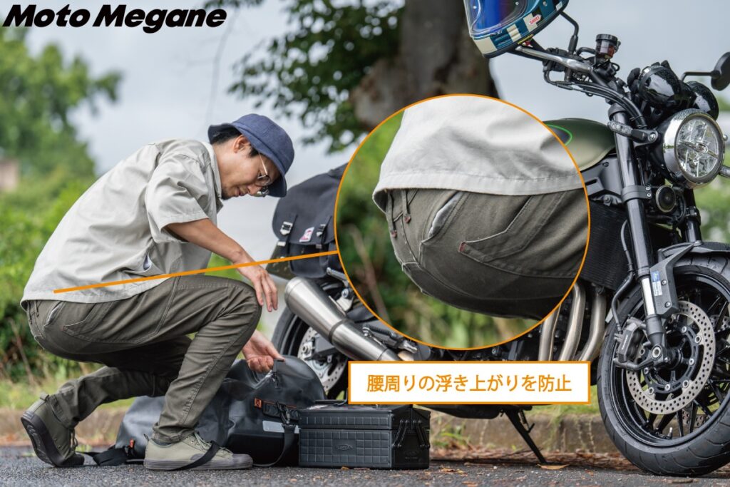 オートバイに乗って前傾姿勢になると、腰部分がどんどんずり上がってきたり、背中とパンツの間に隙間が出来て不快な思いをしたことはありませんか?