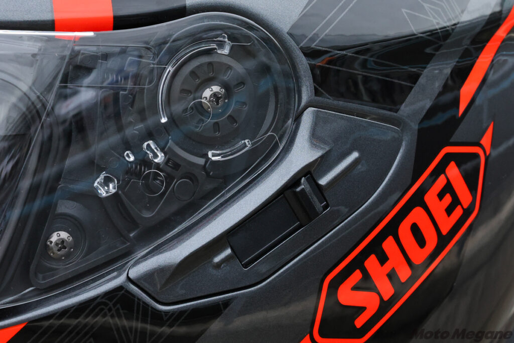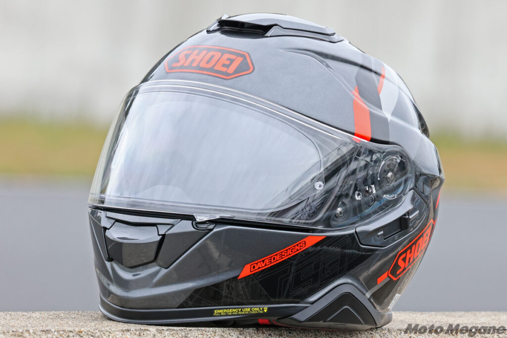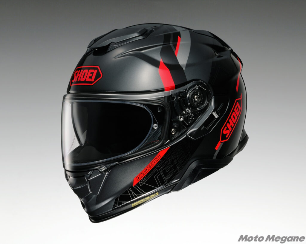 SHOEIのGT-Air Ⅱは、精悍なフォルムに機能性を盛り込んだプレミアムツーリングフルフェイス。最大の特徴は、帽体左側に配されたレバーの上下操作により素早く開閉できるインナーサンバイザーの装備で、これによりトンネル進入時などの急な視界状況変化にも即座に対応でき、スモークシールドの恩恵を受けつつも夜間走行を含むツーリングでシールドを取り換える必要がない。また、GT-Air Ⅱは、いわゆるインカムである専用設計コミュニケーションシステムのSENA製「SRL2」の取り付け機構を装備。チンストラップには、厚手のグローブを装着したままでも操作可能なSHOEI独自のマイクロラチェットシステムを採用している。