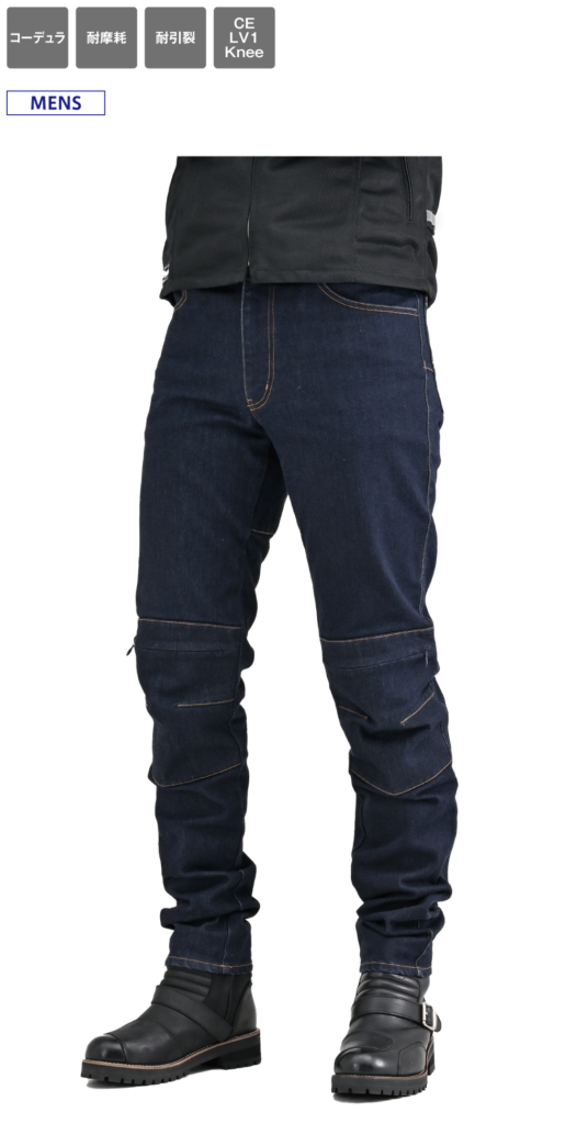 16ozの厚手コーデュラ生地を採用した高強度、耐摩耗性、耐引裂性に優れた寿命の長い厚手のジーンズ。膝プロテクターポケットは外側に設置し、足の入れやすさ、履きやすさとプロテクターの外しやすさを重視しました。股下はバイクにまたがりやすいライディング姿勢にフィットする形状かつ直立時も綺麗に見えるシルエットに仕上げました。膝のプロテクターには、【CE規格】をクリアしたTRIPLEFLEXタイプのSAS-TECを標準装備。