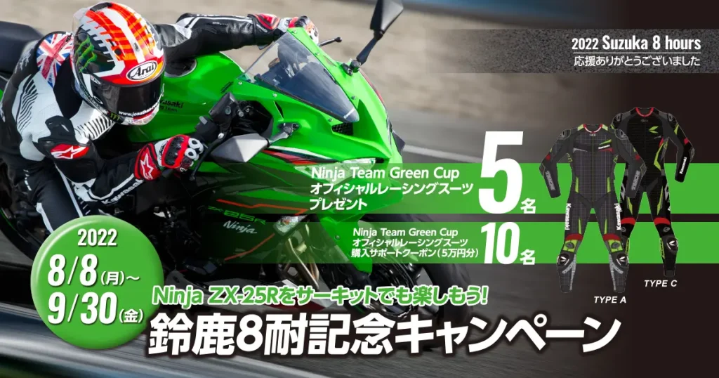 カワサキモータースジャパンでは、2022FIM世界耐久選手権”コカ・コーラ”鈴鹿8時間耐久ロードレースの開催を記念して、期間中「Ninja ZX-25R」をご購入いただいた方の中から抽選で計15名様に「Ninja Team Green Cupオフィシャルレーシングスーツ」もしくは「Ninja Team Green Cupオフィシャルレーシングスーツ購入サポートクーポン5万円分」が当たるキャンペーンを実施します。