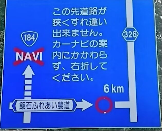 ちなみに、このようなナビに従わずに通行するように注意を促す標識があるくらいなので ナビを過信しすぎるというのは思っているよりも大きな問題になっているのかもしれません。