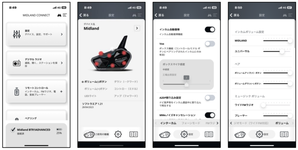 インカムのリモートコントロール機能、ボリューム調整やお好みのラジオ局の登録などの詳細設定が可能です。