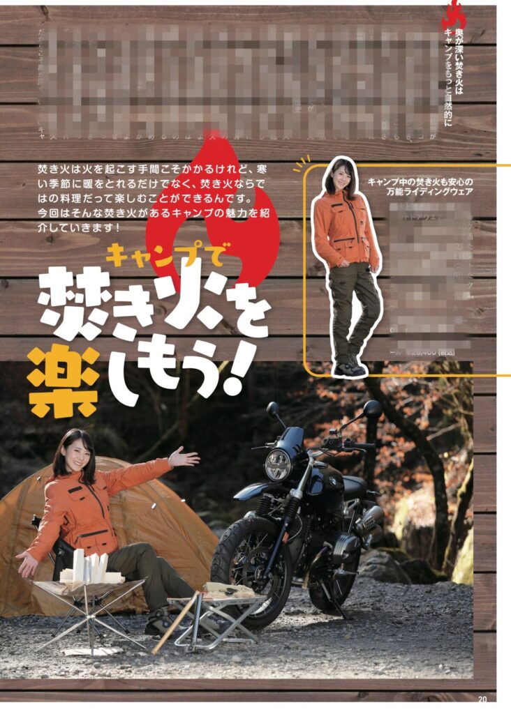 また、毎号おなじみのアウトドア企画ではモデル兼ライダー、インフルエンサーの「ときひろみ」ちゃんが 焚き火の楽しみ方を紹介。寒いこの時期だからこそ、キャンプに焚き火は必須。焚き火台の選びかた、火の起こしかたといった基本をこの特集でマスターしよう!