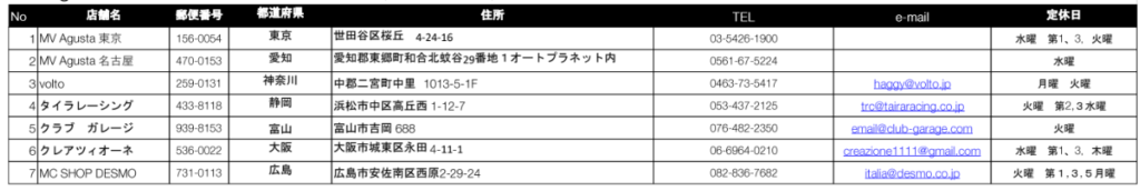 新体制では、MV Agusta専売ディーラーのFLAGSHIP2店舗と併売ディーラーのSTANDARD5店舗でのスタートとなります。詳細は以下のリストをご覧ください。