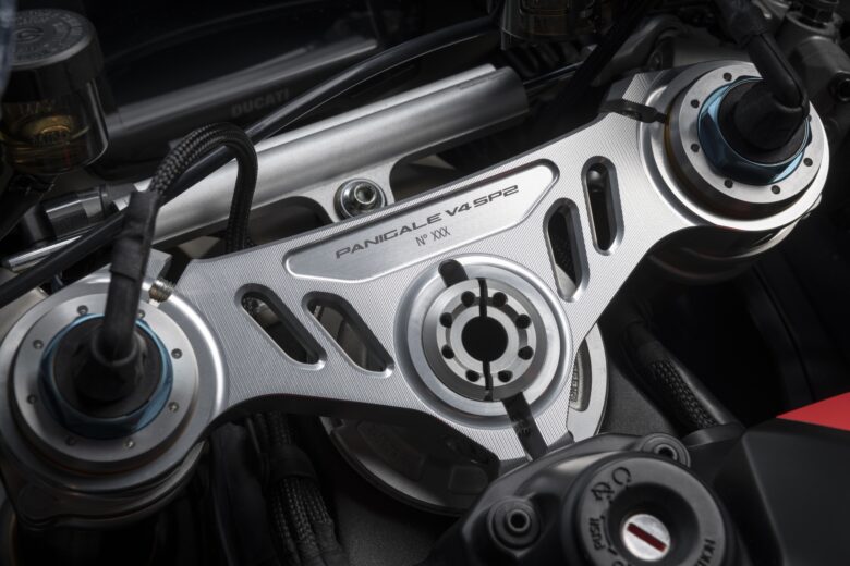 パニガーレV4 SP2のシャシーには、デスモセディチ・ストラダーレエンジンをストレスメンバーとして使用したアルミニウム製フロントフレームが採用されている。アルミ製スイングアームとアルミ製シートポストはエンジンに直接接続されている。スイングアームのピボットは、アンチスクワット効果を高める位置にあり、コーナー立ち上がり時やスロットル開度変化時のリアの沈み込みを抑え、加速時のバイクの姿勢を安定させる。