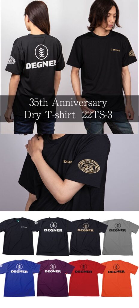そしてもう1着の「22TS-3」は今年で創業35周年を迎えるデグナーを祝う35周年記念Tシャツとなっている。通気性や速乾性に優れたドライ生地を採用し、夏でも快適に着用できる。