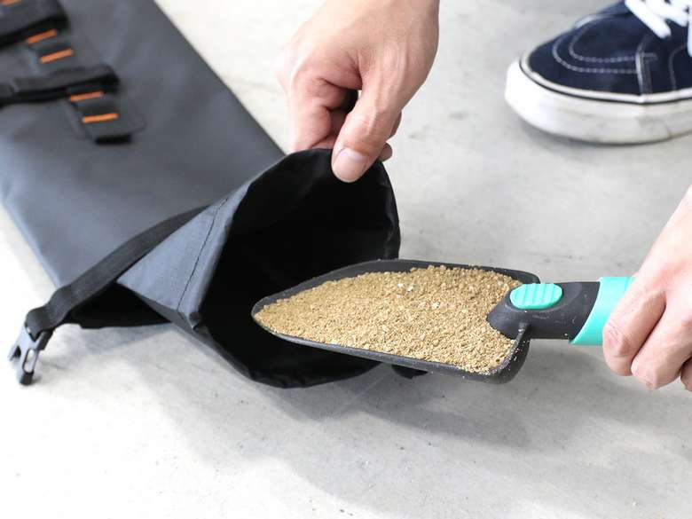 砂(別売り)を使用。水を使うウォーターウェイトと異なり凍結の心配がなく、冬の常設も安心だ。