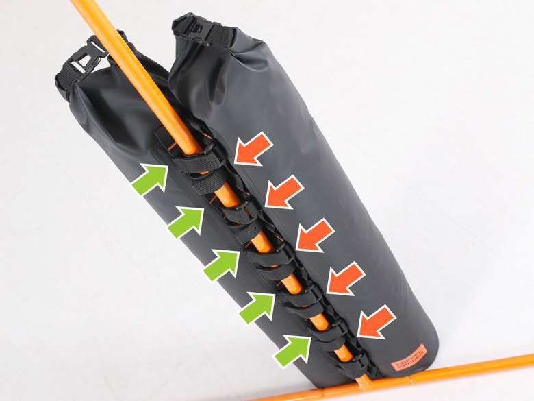 固定用ベルトの高さが調整できるため、段違いで設定すれば1つのパイプに対して複数のウェイトが固定できる。