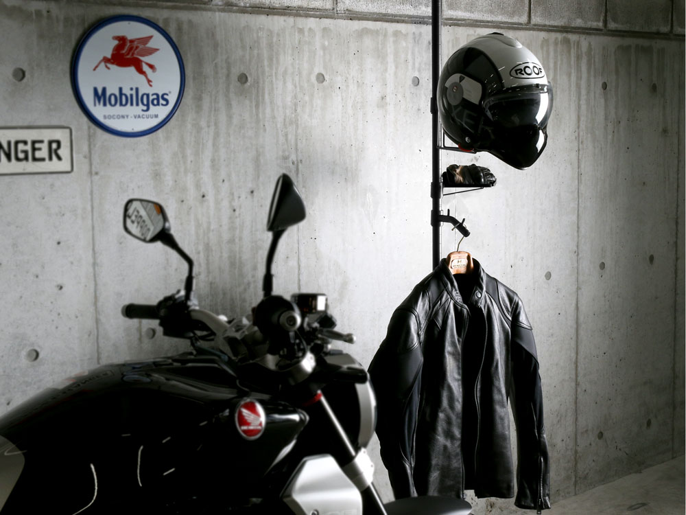 ヘルメットやジャケットなどバイクの乗車時には多くのアイテムが必要です。ガレージワンポールラックは、日常的に使用されるそれぞれのアイテムを1箇所にまとめることができるスマート収納ラックです。1本のスチールパイプを天井と床でつっぱり固定して設置するので、空間の限られたガレージ内の収納などに使用できます。