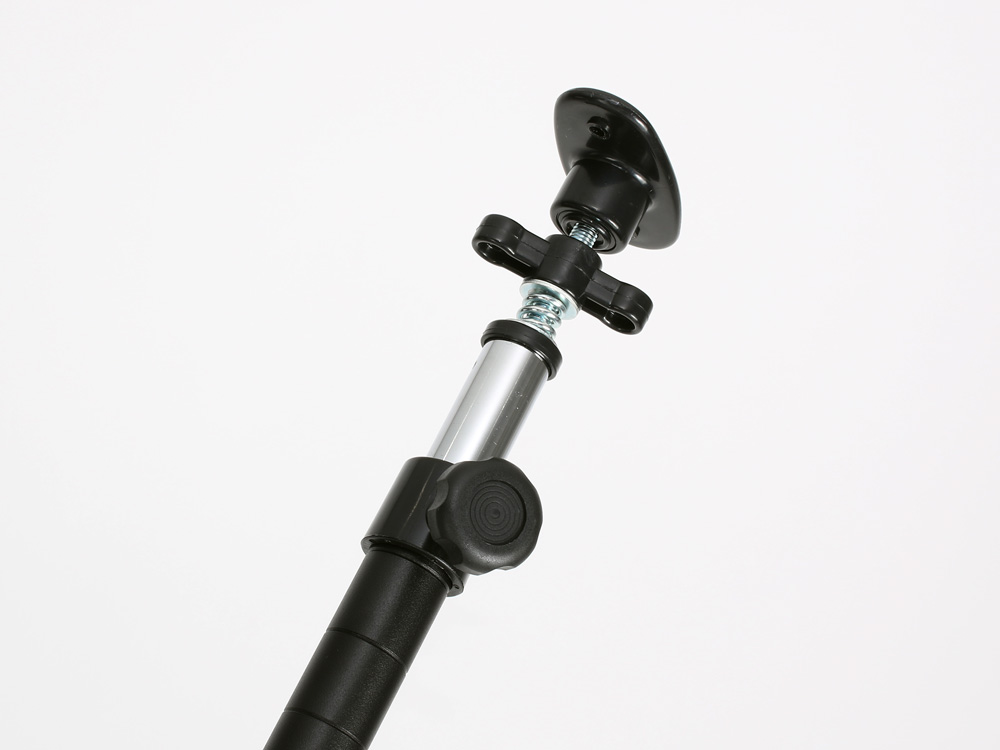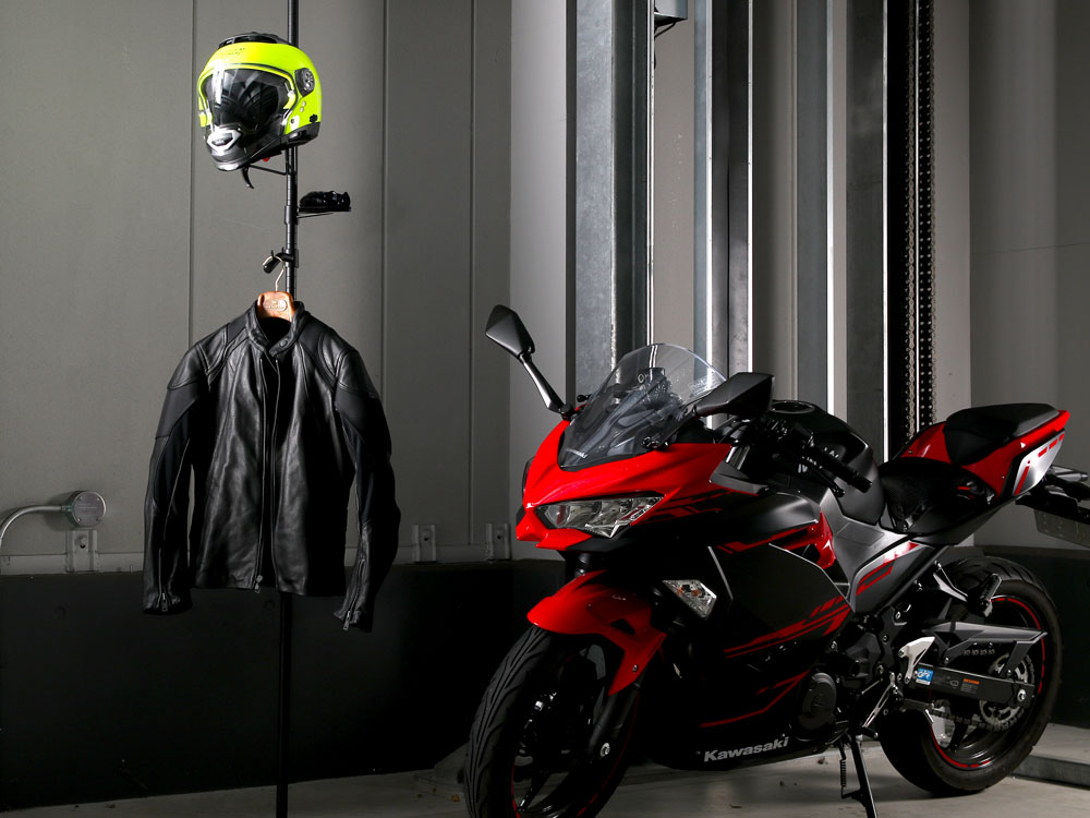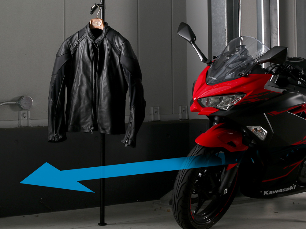 限られたスペースでも設置できるよう、つっぱり棒タイプのワンポール形状を採用しました。バイクの置かれたガレージの角や玄関先などの限られた場所でも設置出来、天井近くなどの空間を有効に使用できます。