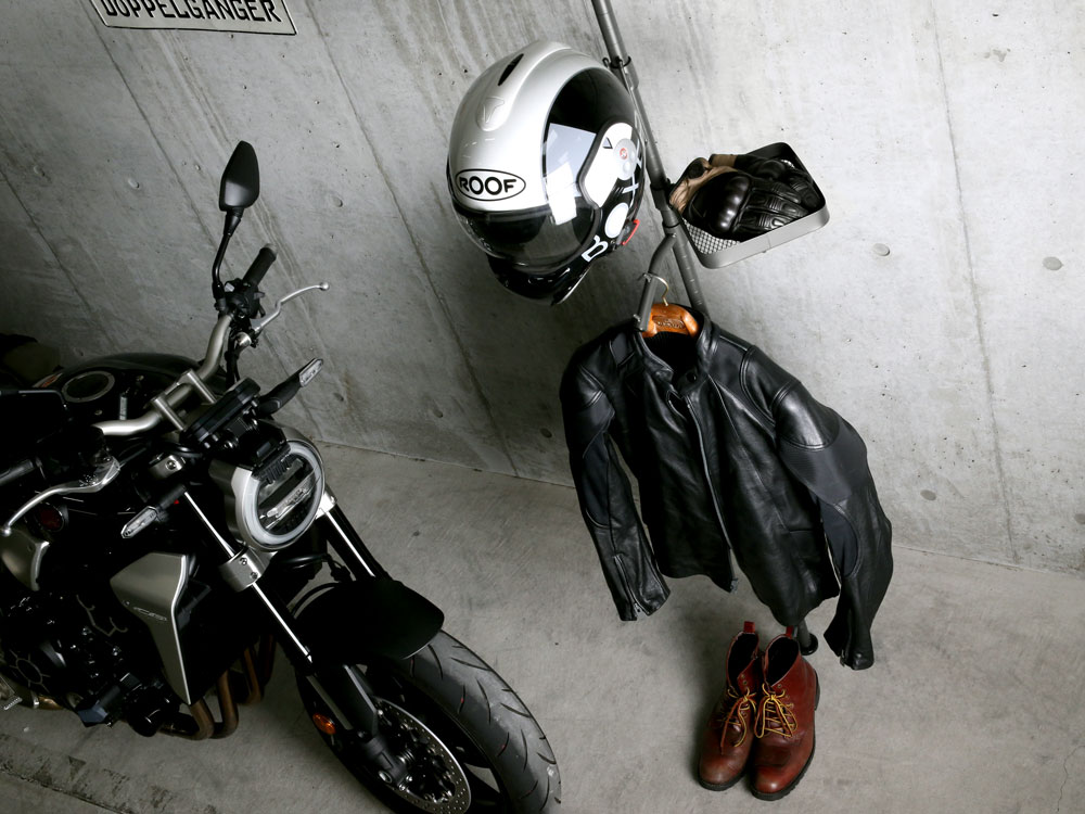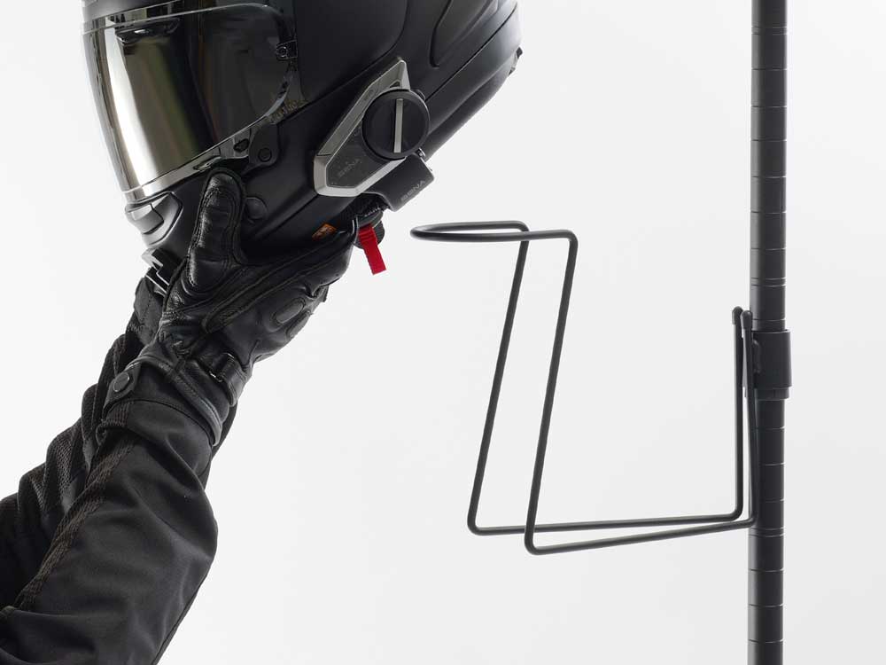 ヘルメット収納専用のヘルメットハンガー。ヘルメットの開口部を塞がないフック形状なので、ヘルメット内の通気性を改善する専用フックです。