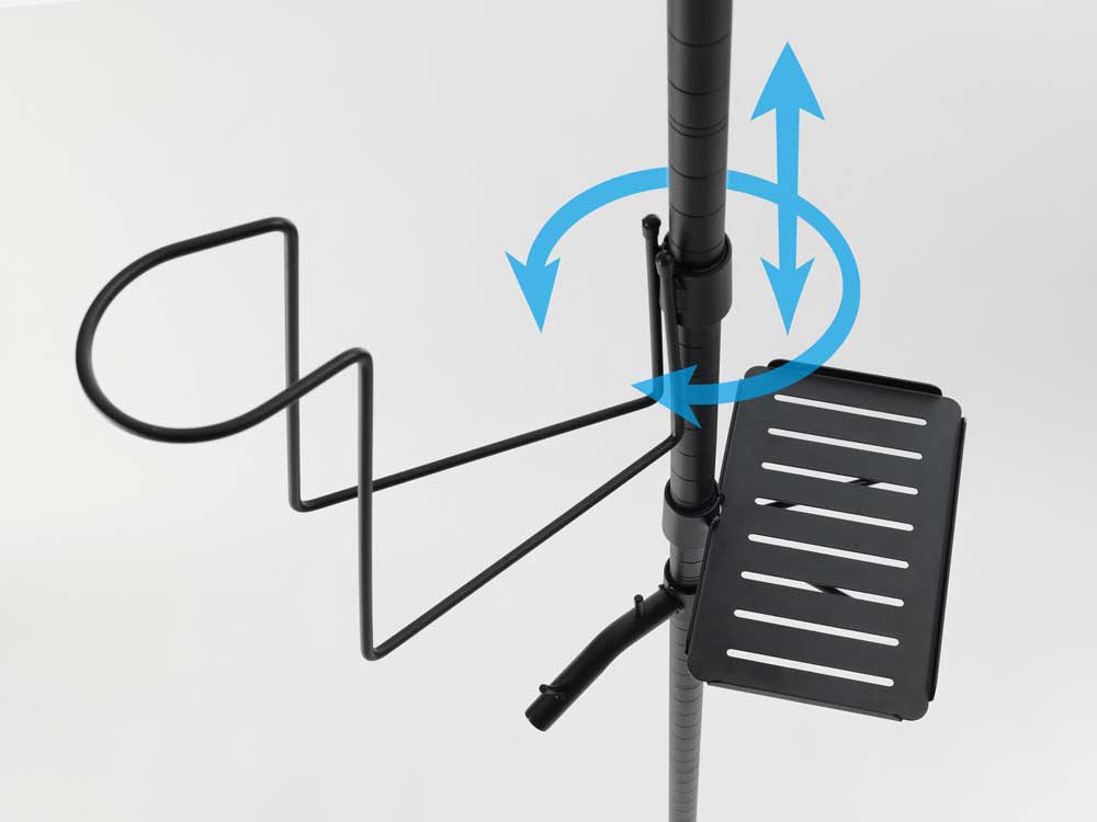 ヘルメットハンガー、トレイ、ハンガーフックのそれぞれのパーツは高さ、順番などを自由に設定することが可能。設置場所の環境や、身長に合わせて調整可能です。