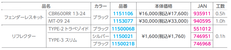 株式会社アクティブは、MT-09・CBR600RR用フェンダーレスキットとグリップを発売する。