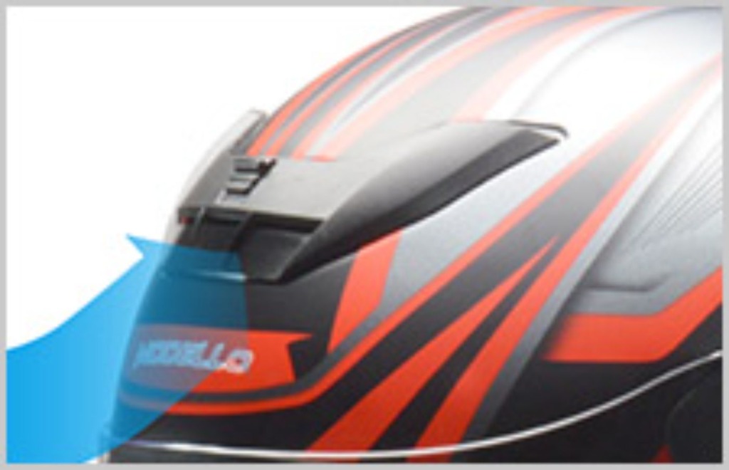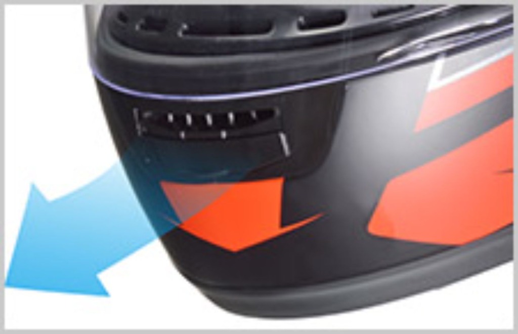 前頭部に大型エアベンチレーションを装備。走行風をベンチレーションから取り込みヘルメット内部にこもりやすい熱やムレを解消。