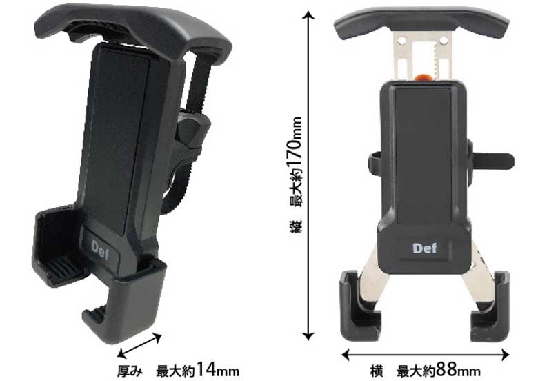 ホルダーは4.7~6.8インチのスマートフォンに対応している。最新機種iPhone13シリーズも取り付け可能。マウントは22.2mm~1.25インチの海外のハンドルバーにも対応している。しかも工具いらず、スペーサーいらずですぐに取り付け可能だ。ホルダーはバネで広がる。