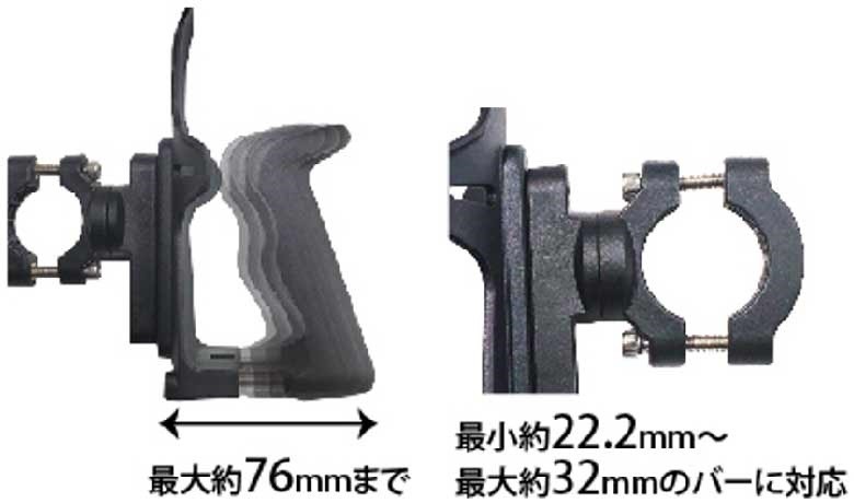 ハンドル径は22.2ミリから32ミリまで対応している。国産、外車問わず様々なバーに取り付けすることが可能。ボトルケージの底面に四角いボタンがあり、それを押しながら前後に広げたリして、ボトルを固定可能。