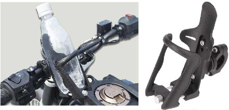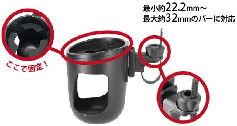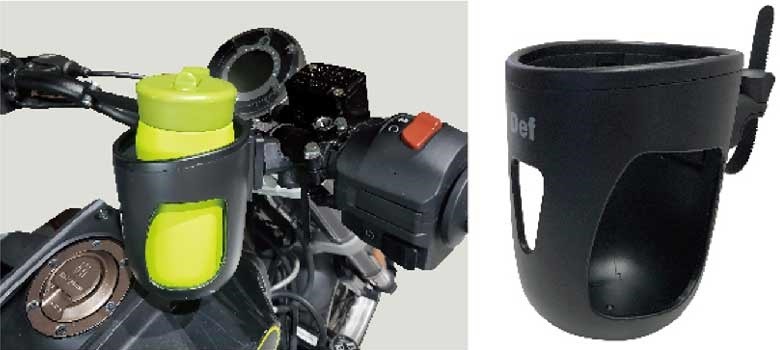 これまでのドリンクホルダーとは一線を画す形状である。ハンドル径は22.2ミリから32ミリまで対応している。テーパーバーや1.25インチなどの大き目サイズでも取り付け可能。しかも工具いらず、スペーサーいらずですぐに取り付け可能だ。