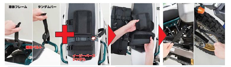 通常の片持ちバッグは荷物を入れるとバッグが下に垂れさがってきてしまうという欠点がある。専用設計の補助ベルトと新取付けベース「イージーベースシングル」がそんな垂れ下がりを防止する。