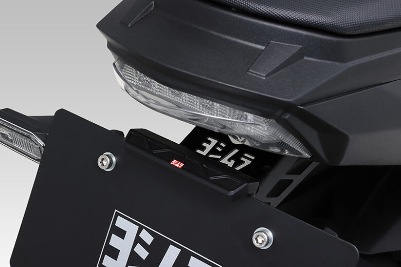 プレートホルダーの裏側の「ヨシムラ」肉抜きもカスタムマニアの心をくすぐることだろう。価格はナンバー灯も付属し、2万350円(税込み)だ。
