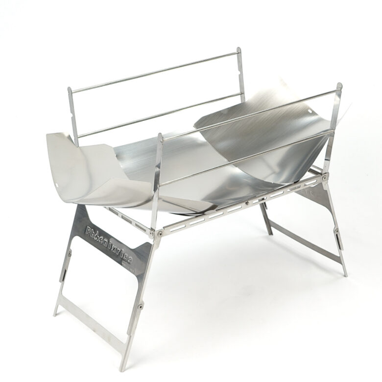 通常の火床より長い薪を使用できる、3枚火床がセットになったフェニックスグリル。脚とアームを開き、アームの窪みに広げた火床パネルをはめ込むだけと組み立ても簡単。焚火台としてのほか、調理用グリルとして火力の強さに応じて上段・下段を使い分けることができ、アームを畳めばクッカーや簡易テーブルとしても使用できる。高さも脚を2段階で変えることができ、様々なスタイルで使用可能だ。