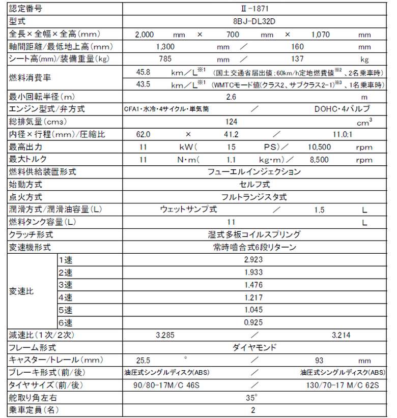 - 4:WMTCモード値は、発進、加速、停止などを含んだ国際基準となっている走行モードで測定された排出ガス試験結果にもとづいた計算値である。走行モードのクラスは排気量と最高速度によって分類される。