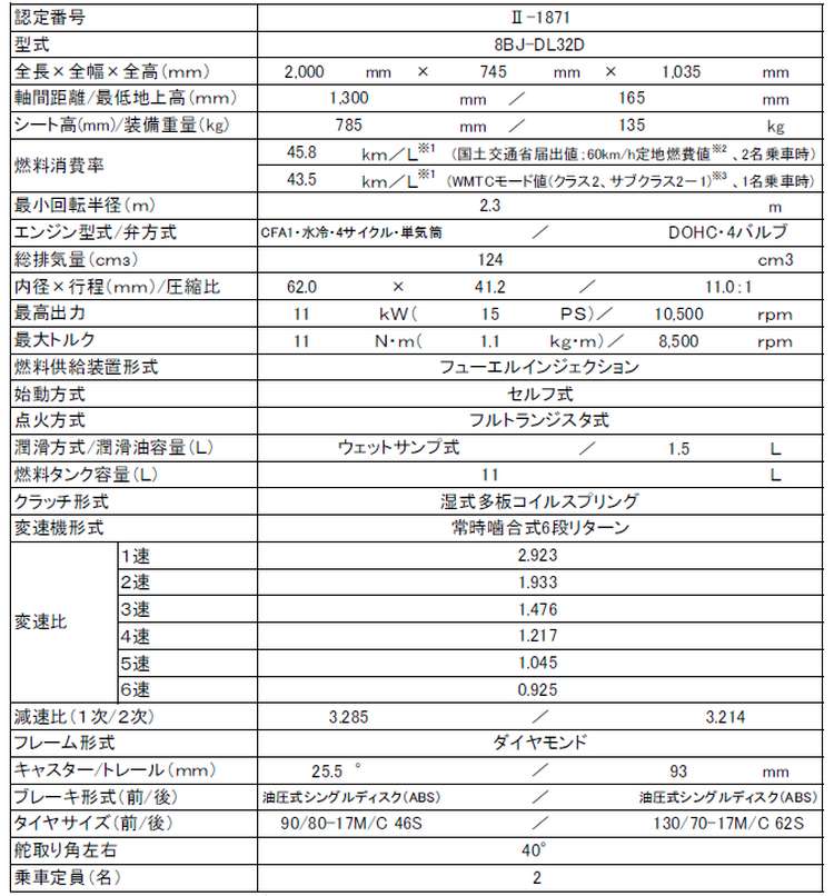 - 124cm3水冷4バルブ単気筒DOHCエンジン。GSX‐Rシリーズの解析技術を用いた燃焼室の最適化や、吸気効率の向上、燃料噴射の最適化などにより、最高出力11kW/10,500rpm、最大トルク11N・m/8,500rpmの出力性能と45.8km/L※1の燃費性能を実現。