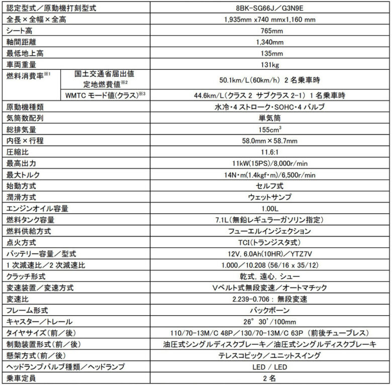 ※3:WMTCモード値は、発進、加速、停止などを含んだ国際基準となっている走行モードで測定された排出ガス試験結果にもとづいた計算値である。走行モードのクラスは排気量と最高速度によって分類される。