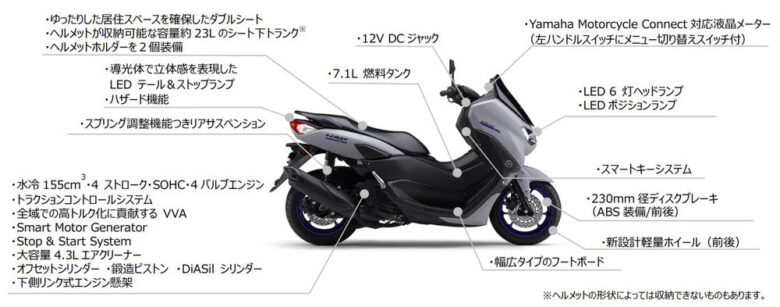 ※ BLUE CORE:ヤマハ発動機株式会社は、“走りの楽しさ”と“燃費・環境性能”の両立を高次元で具現化するエンジン設計思想として、2014年より“BLUE CORE” を掲げている。この思想は高効率燃焼、高い冷却性、ロス低減の3点にフォーカスして性能実現を図るもので、「NMAX155 ABS」のエンジンもこの“BLUE CORE”思想に基づき開発した。商標登録第5676267号。