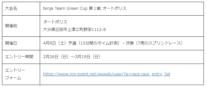 Ninja Team Green cup第1戦 オートポリス エントリー開始