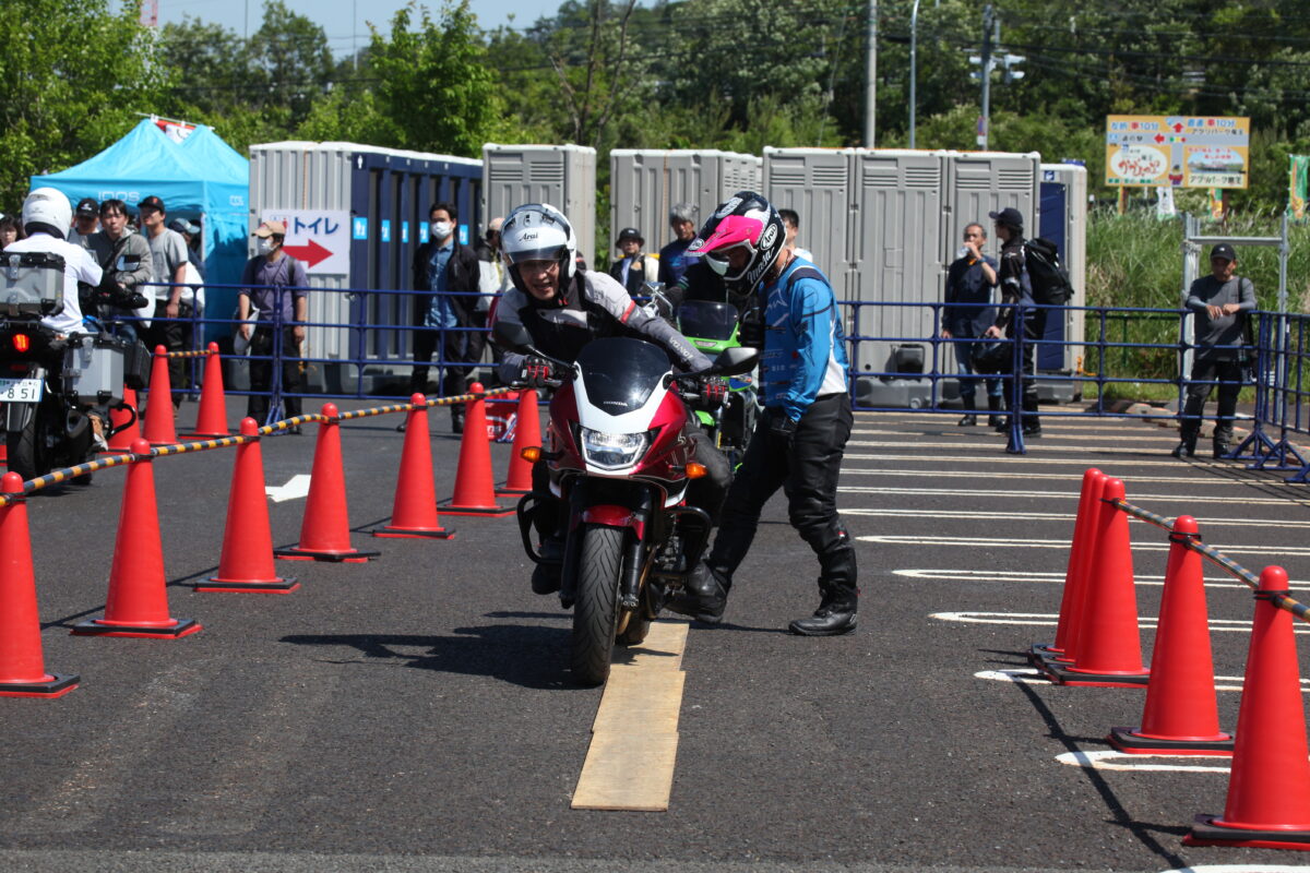 広めのスペースにパイロンが置かれた特設エリアは、バイクが乗れるようになっている。ここで行われたのがバイクの乗り方・基礎レッスン。なんとフラットダートでは世界で名を馳せる大森雅俊選手。と言っても初心者向けに「ライディングの基礎」を教えてくれるので、ビギナーでも安心して参加できるぞ。午前と午後を合わせて2回行われた。