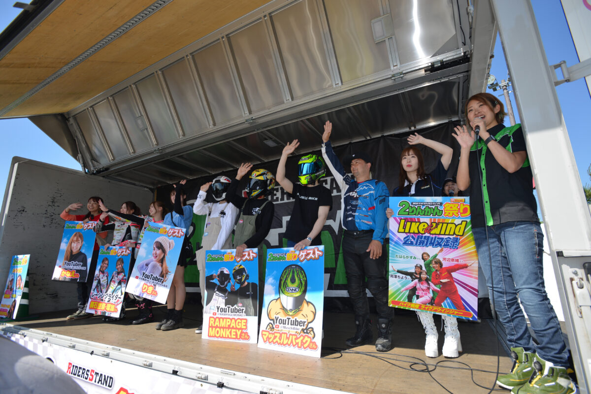 メインステージではトークショーなどがたくさん行われた。レーシングライダーの桐石姉妹の二人やRAMPAGEMONKEY、マッスルバイクさん、かなえさん、りきさんらが登場。人気番組のLike a Windの公開収録も行われた。トークが終わった後にはステージ脇で本人からグッズの購入ができたりもするなど、ふれあいが多くなっていた。