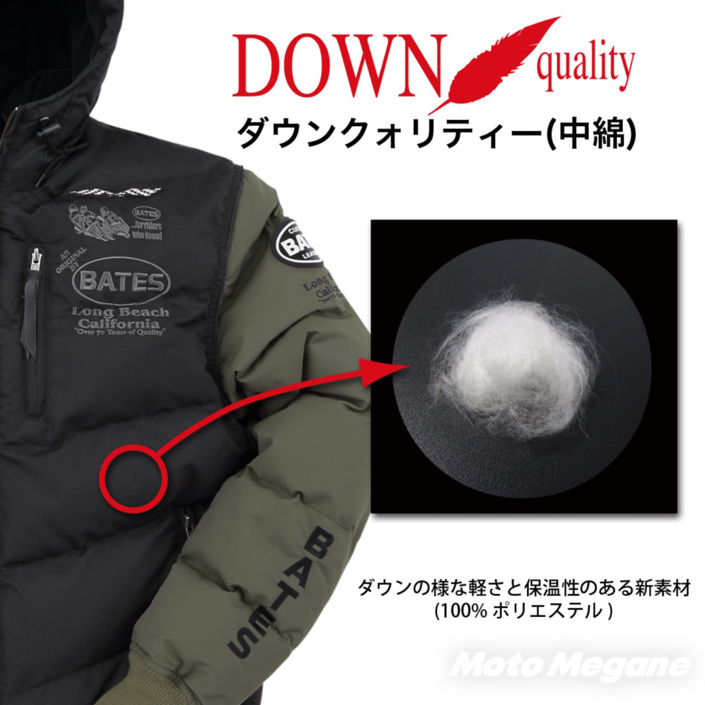 BATESの最新ジャケット「SA-N2155」は、ダウン同等の保温性と軽さを持った新素材「ダウンクオリティ」を中綿として採用したバイクウェアだ。