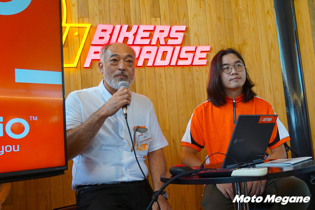 当日はデイトナの社長やスタッフはもちろん、ドライブレコーダー・Mio(ミオ)シリーズを開発・製造している台湾のマイタック・デジタルテクノロジー社の社長や多くのスタッフも登場。デイトナが同社の製品を取り扱うようになった経緯やマイタック・デジタルテクノロジー社の紹介、そして新製品の新しい機能などが紹介された。