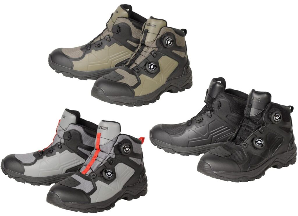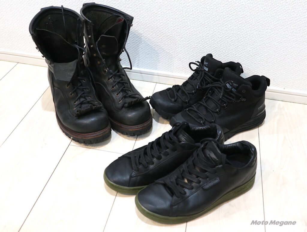 上の写真のスニーカー、トレッキングシューズ、ブーツ。安全性、操作性を考慮せずバイクに乗るだけなら、これら通常のフットウエアでもこと足りてしまいます。