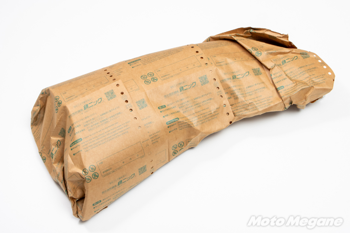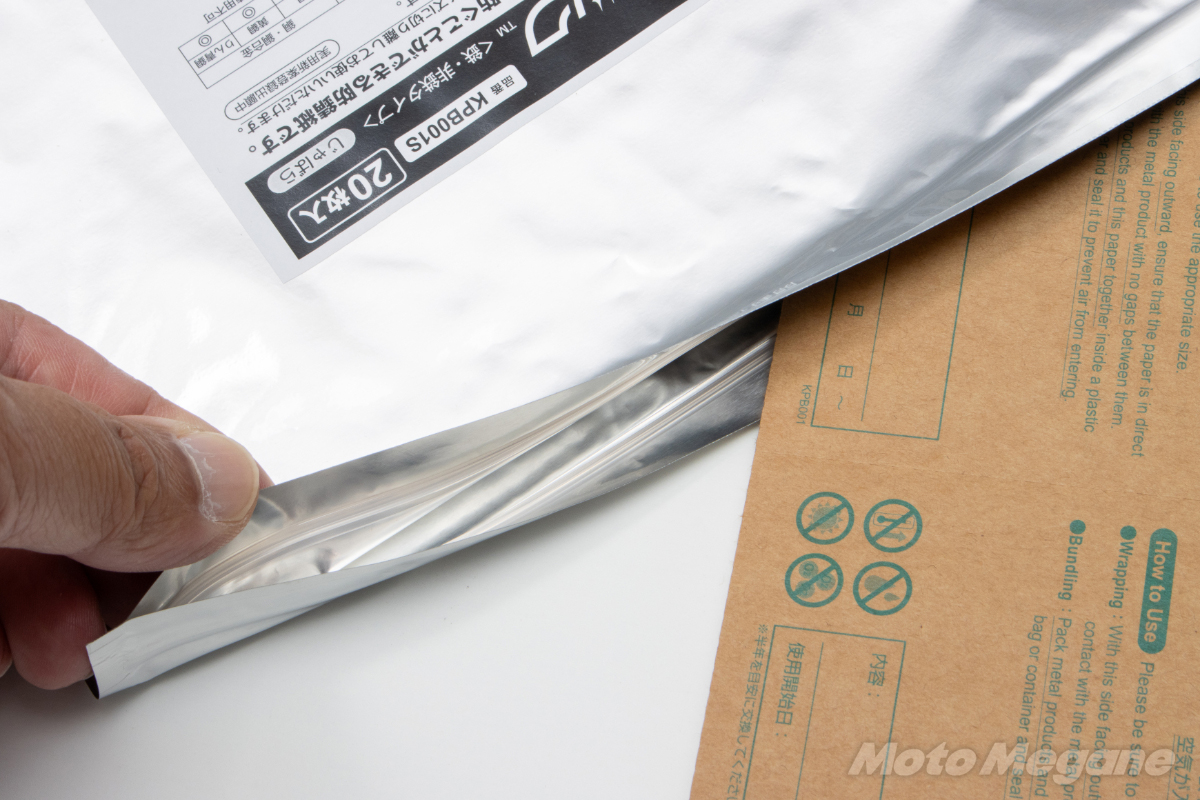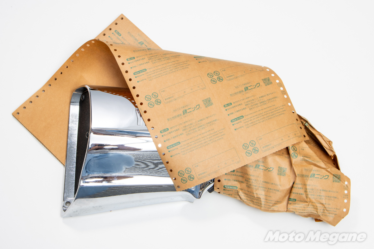 そんなバイクのストックパーツが必要になるのは、明日なのか30年後なのか予想ができないものだ。来たるべきその日に備えてパーツのコンディションを維持するために包むだけで錆を防止できる錆ニックを有効活用していただきたい。