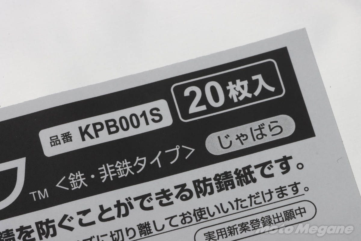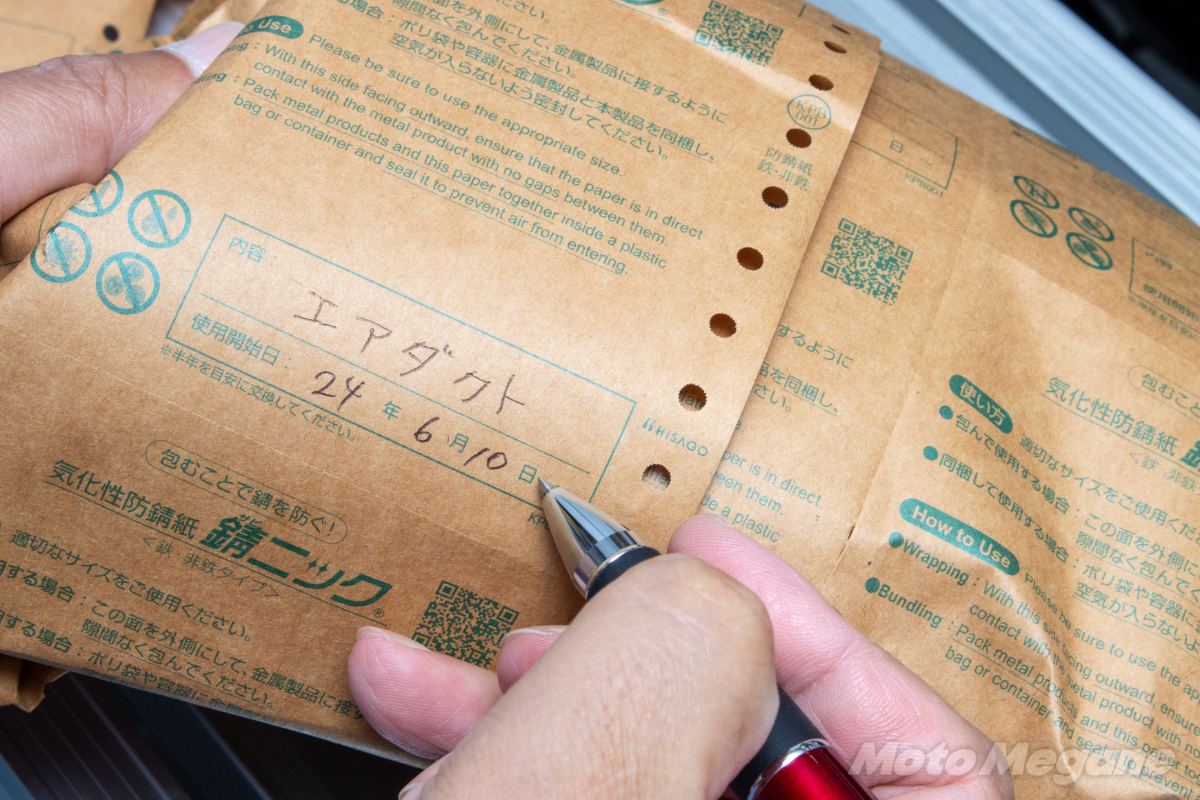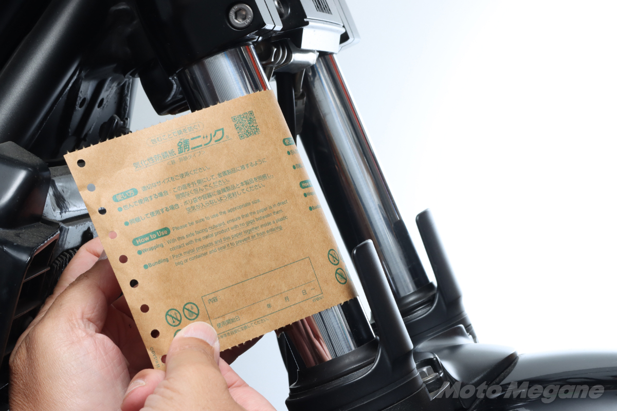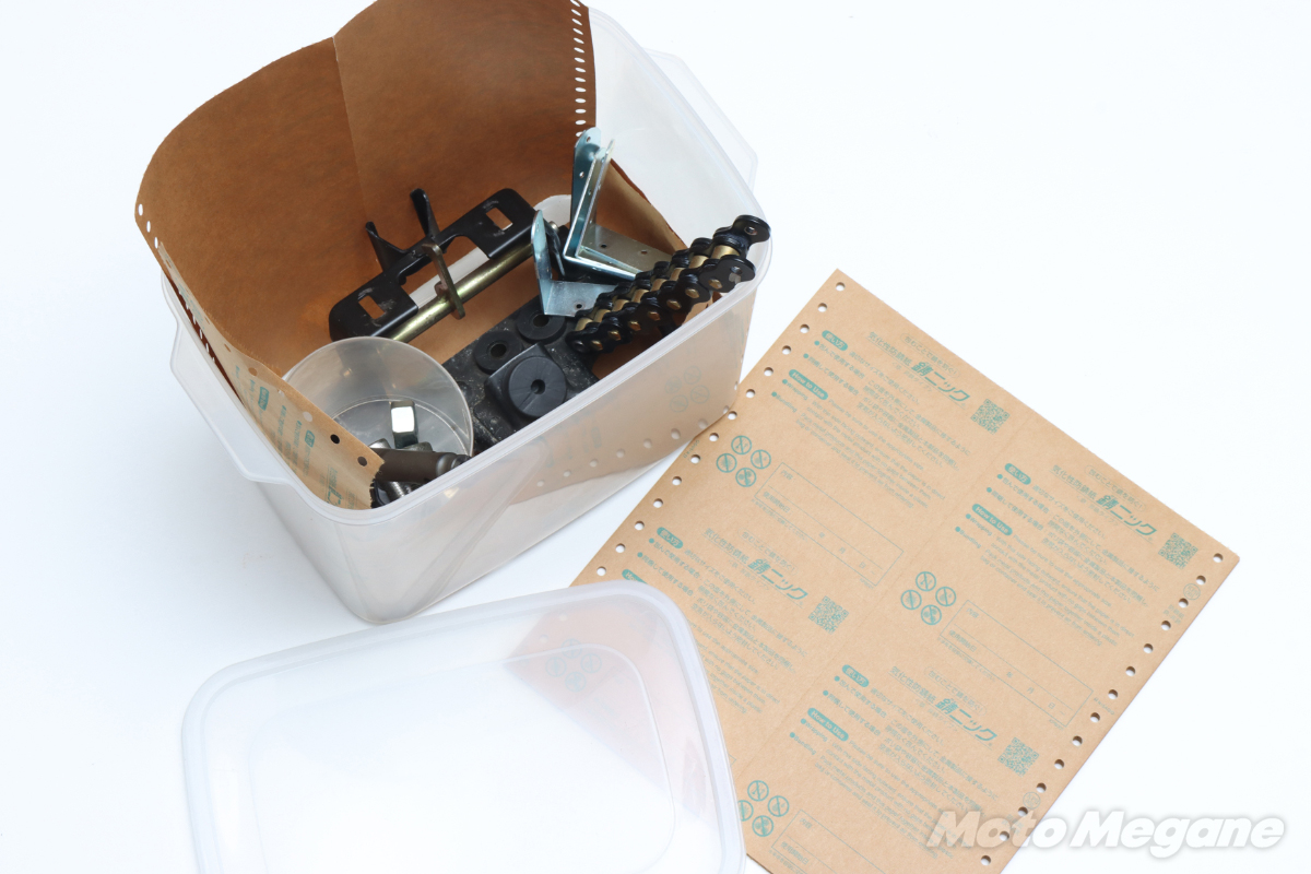 そんなバイクのストックパーツが必要になるのは、明日なのか30年後なのか予想ができないものだ。来たるべきその日に備えてパーツのコンディションを維持するために包むだけで錆を防止できる錆ニックを有効活用していただきたい。