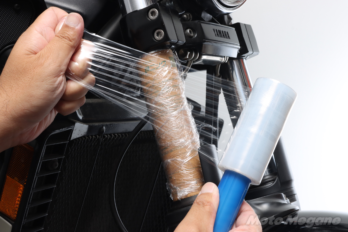 インナーチューブが単品になっていれば包みやすいが、長期保管の場合や寒い時期に冬眠させる度にフロントフォークを分解するわけにはいかない。そこで、車体のままで錆ニックで保護しておく。