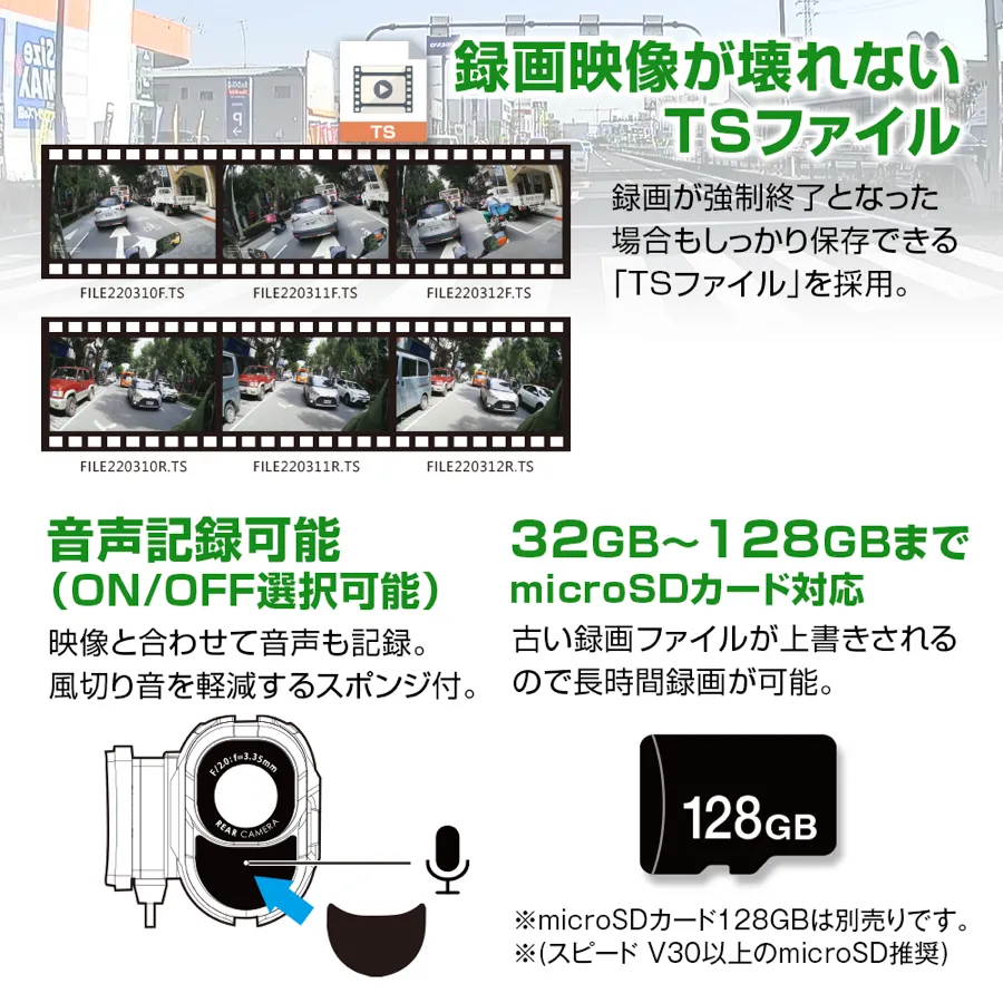 ちなみにGセンサーとは衝撃を感知した際の録画データをロックする、つまりは「事故の疑いがあるシーン」を保護するドラレコならではの機能で、MF-BDVR001Gは傾き動作検知機能でこれを実現しています。