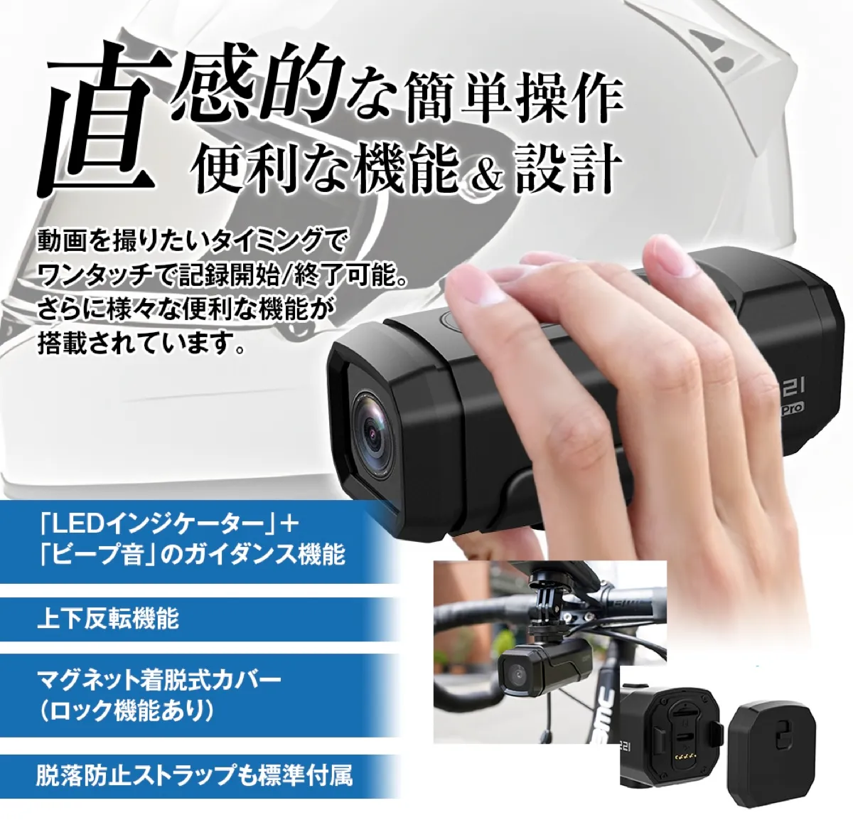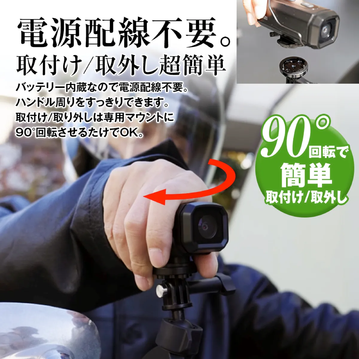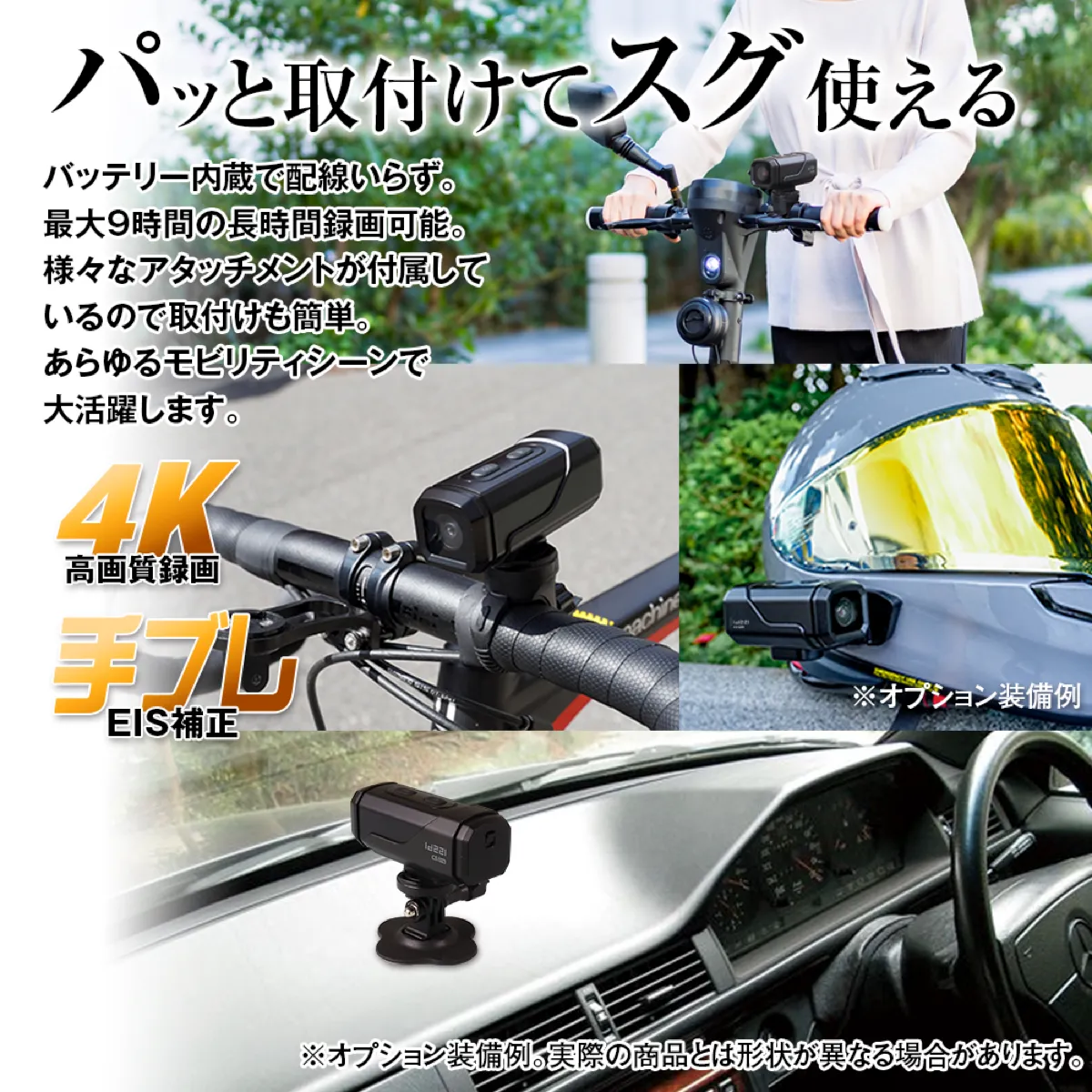 なんと!配線不要で手ブレ補正ありの4K録画ができる、から〜の?めっちゃコンパクトでバイクにも車にも自転車にも取り付けできる、から〜の?しかも付け替え可能だからこれ1台だけでOK!という実にけしからん…いや、実に優秀なドラレコでございます。