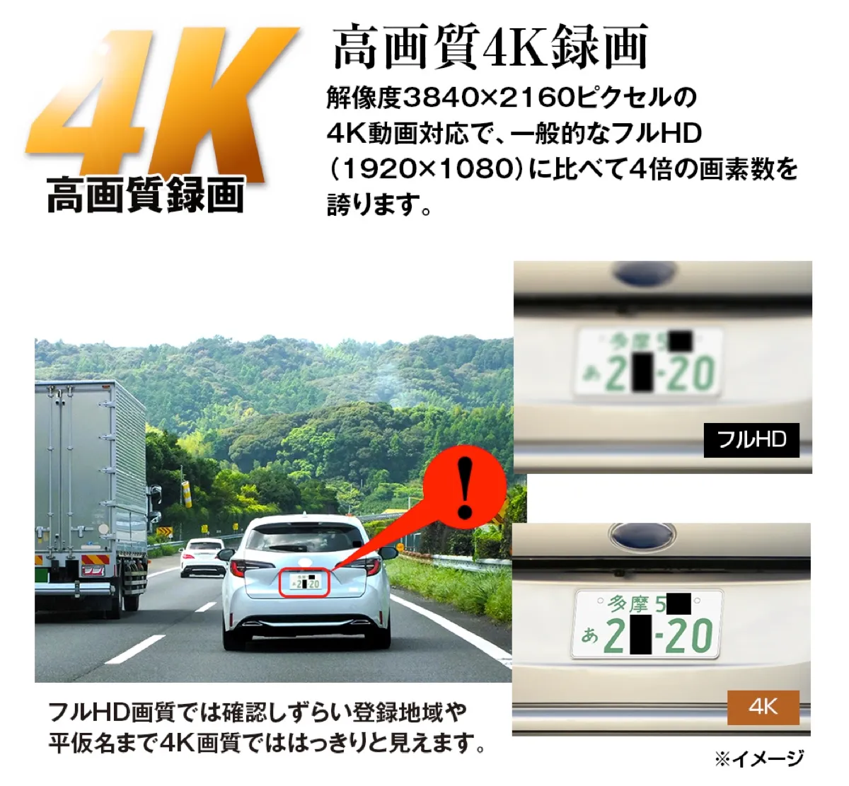 これによりFullHD画質では確認しづらかった「他車ナンバープレートの登録地域や平仮名」もハッキリと確認することが可能で、万が一の際の心強い証拠となってくれます。