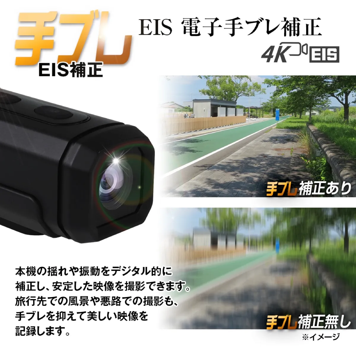 実は4K画質に加えて電子手ブレ補正の「EIS」を搭載しているので、ドラレコの他に「モトブログ用アクションカメラ」としての使い方も可能だったりします!