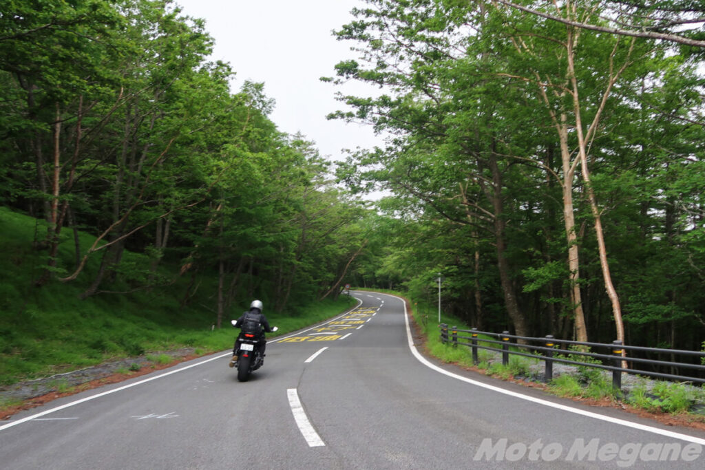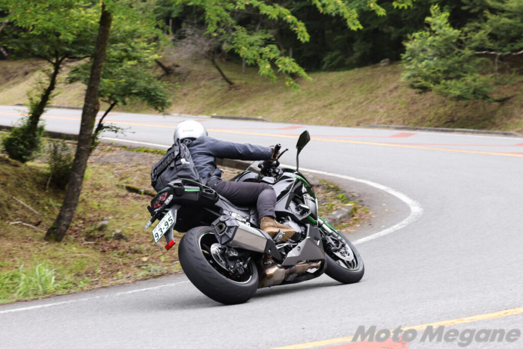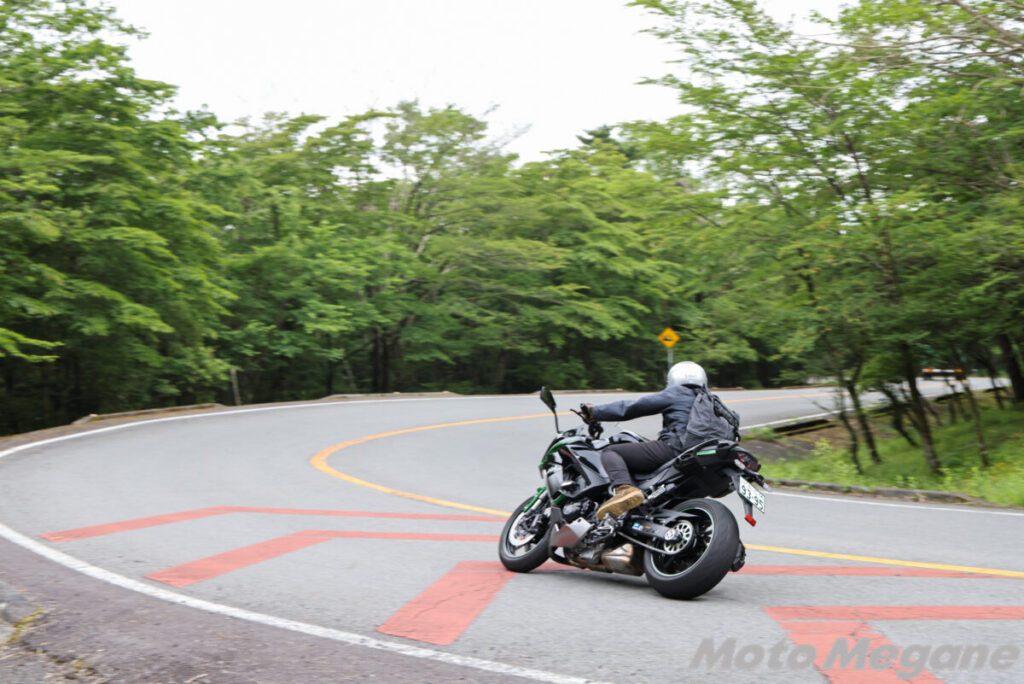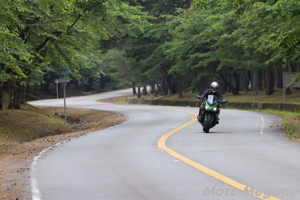 今回は富士周辺のワインディングにNinja 1000SXを持ち込みました。勾配がきつく、タイトコーナーも連続するワインディングは車重のあるビッグバイクで走るには緊張を強いられるものですが、予想していた以上にNinja 1000SXは軽快な走りを見せてくれました。高速道路の印象から「安定志向のハンドリングかな?」という予想をしながらコーナーへ入ったのですが、実際には思ったラインをしっかりとトレースできる味付け。かといって余分に切れ込んでいくことなく、極めてニュートラルなハンドリングです。筆者はコーナーで腰を落とすようなライディングもできないような一般的なライダーです(峠道は大好きです)が、そういうレベルのライダーでも安心できる乗り味なのです。ちょっとスピードを上げてバンク角を深めにしたとしても、乗り手がおかしなアクションをおこさない限り、狙ったライン通りに駆け抜けることができます。