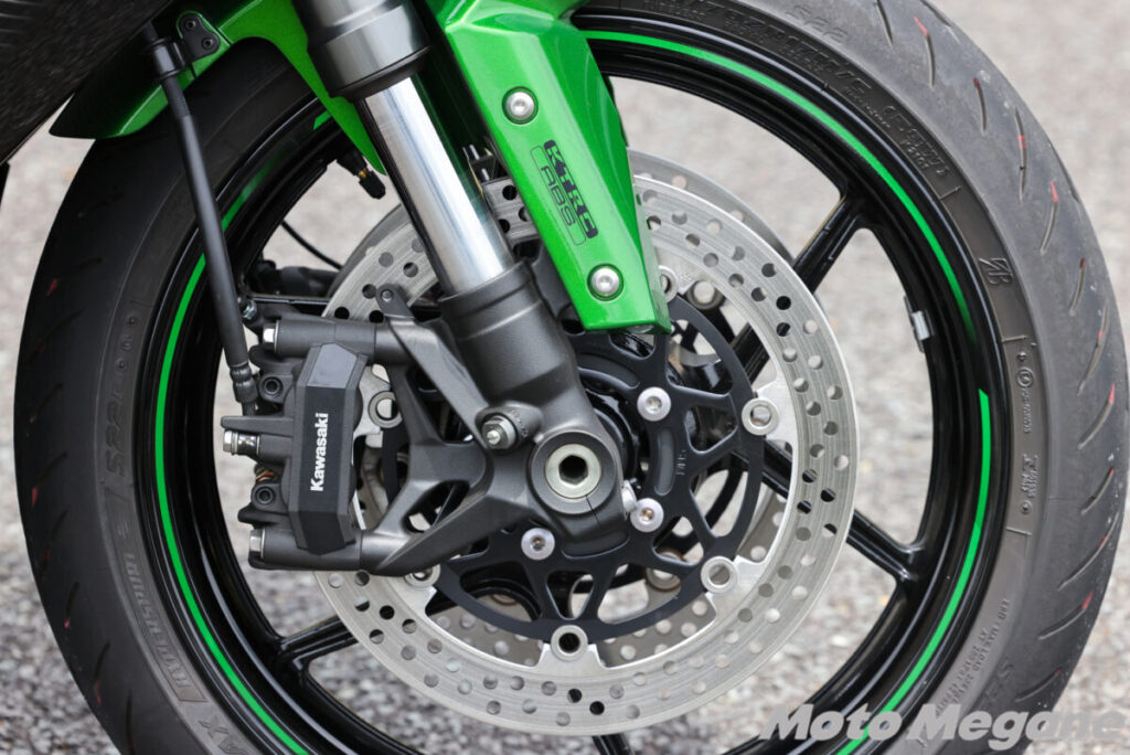 KIBS(カワサキインテリジェントアンチロックブレーキシステム)を装備。この最新世代のABSはECUやIMUとも連動しながら常に適切な油圧に制御。ワインディングでのハードブレーキングや急制動時、さらにコーナーリング中にブレーキングでも自然なフィーリングです。