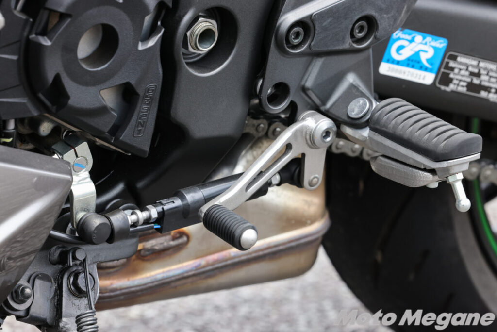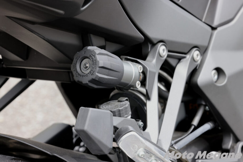 リアサスペンションはプリロードアジャスター付きで、タンデムや荷物の積載時には重宝します。タンデムステップにはオプションのパニアケースをそのまま装着できる突起が設けられています。パニアケースを装着すれば長旅も快適に過ごせるでしょう。