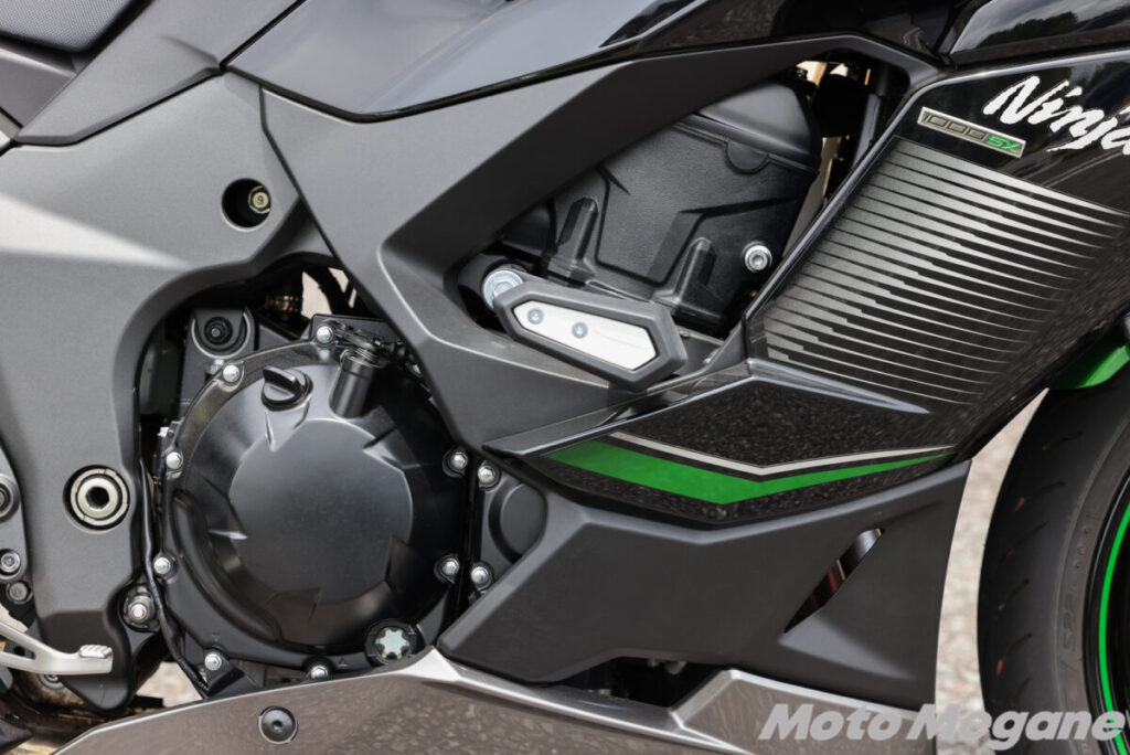 エンジンは熟成を極めた水冷並列4気筒で排気量は1043cc。Ninja ZX-9Rをルーツとするこのエンジンは、低回転から豊かなトルクを発揮しながら、高回転域では胸のすくような加速感を堪能できる実績のあるエンジンで、Ninja 1000SXでは吸気ファンネルの最適化と新型のエキゾーストシステムとの組み合わせによって全域で扱いやすい特性を実現しています。