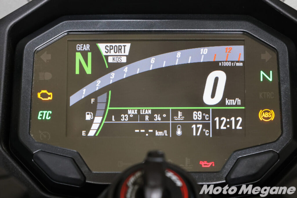 Ninja 1000SXにはメーター上にリアルタイムのバンク角や最大バンク角を表示できるモードがあります(写真上)。ワインディングに入るまでは30度程度のバンク角を表示していましたが、いざワインディングではどうなるのか?