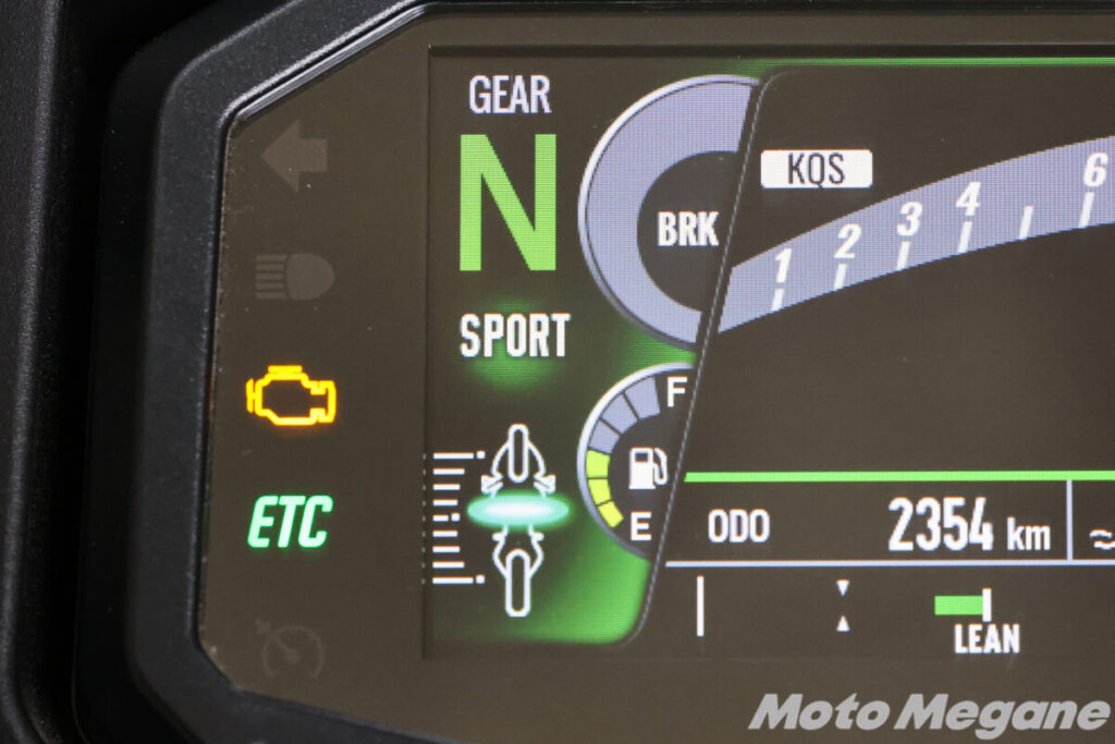 写真下は6軸IMUを活かしたメーター表示です。メーター左下にバイクのイラストと緑のポインターが表示されていますが、これは車体の重心位置を示すもの。ポインターが前方に動けば重心が前、後ろにいけば重心が後ろに移ったことを意味します。坂道やブレーキングでの姿勢変化は即座にこのモードであればチェックできます。また、荷物積載時やタンデムランの際には、この重心位置を参考にプリロードなどを変更すると良いかもしれません。