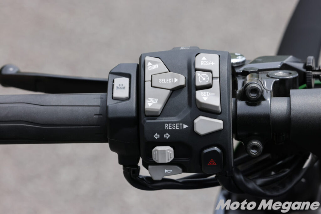 またNinja 1000SXではクルーズコントロールを装備しています。スポーツツアラーには欠かせない装備のひとつですが、スイッチ自体は直感的に操作できます。
