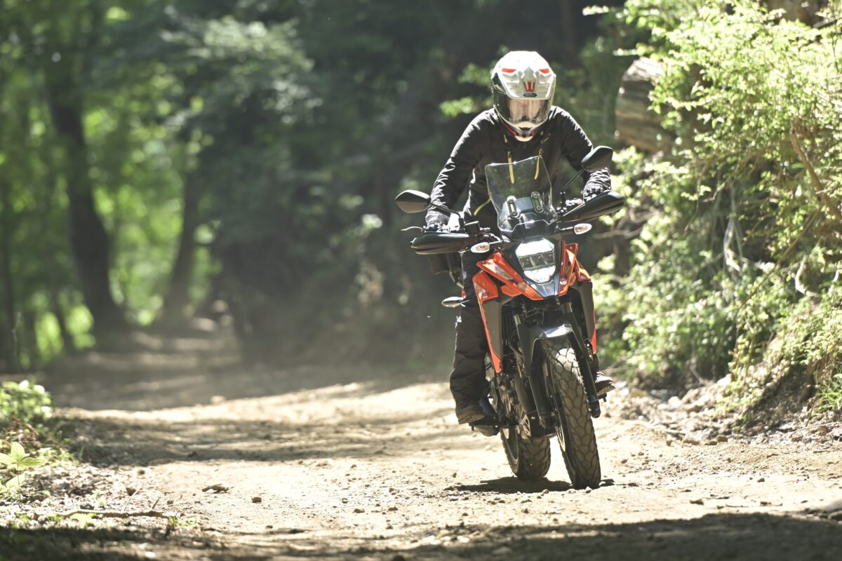 アイドリング付近から粘るトルクは、ラフロードではトラクション性のよさとしても感じられる。低回転でもエンストしにくく、標準装備のマキシス製タイヤはオンロード寄りのパターンながらラフロードでも意外とグリップ力を発揮する。オフロードバイクに近いアップライトなライディングポジションは走行中のバランス修正がしやすく、前後サスの衝撃吸収性もいいので、ラフロードでは予想以上に取り回しやすい。軽快な走りはVストロームシリーズでもトップレベルだと感じた。